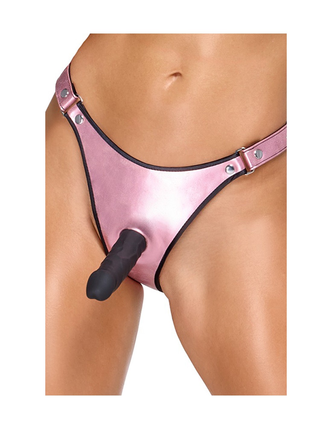 Strap-on string rose métallisé avec godemiché en silicone noir intégré, réglable et doublé pour un confort optimal et un look sexy.