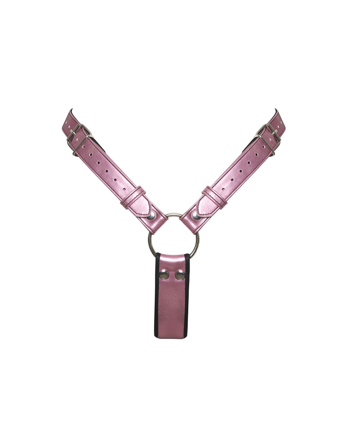 Strap-on string Bad Kitty au look rose métallisé irisé, pensé pour offrir à la fois sensualité, maintien et plaisir partagé.