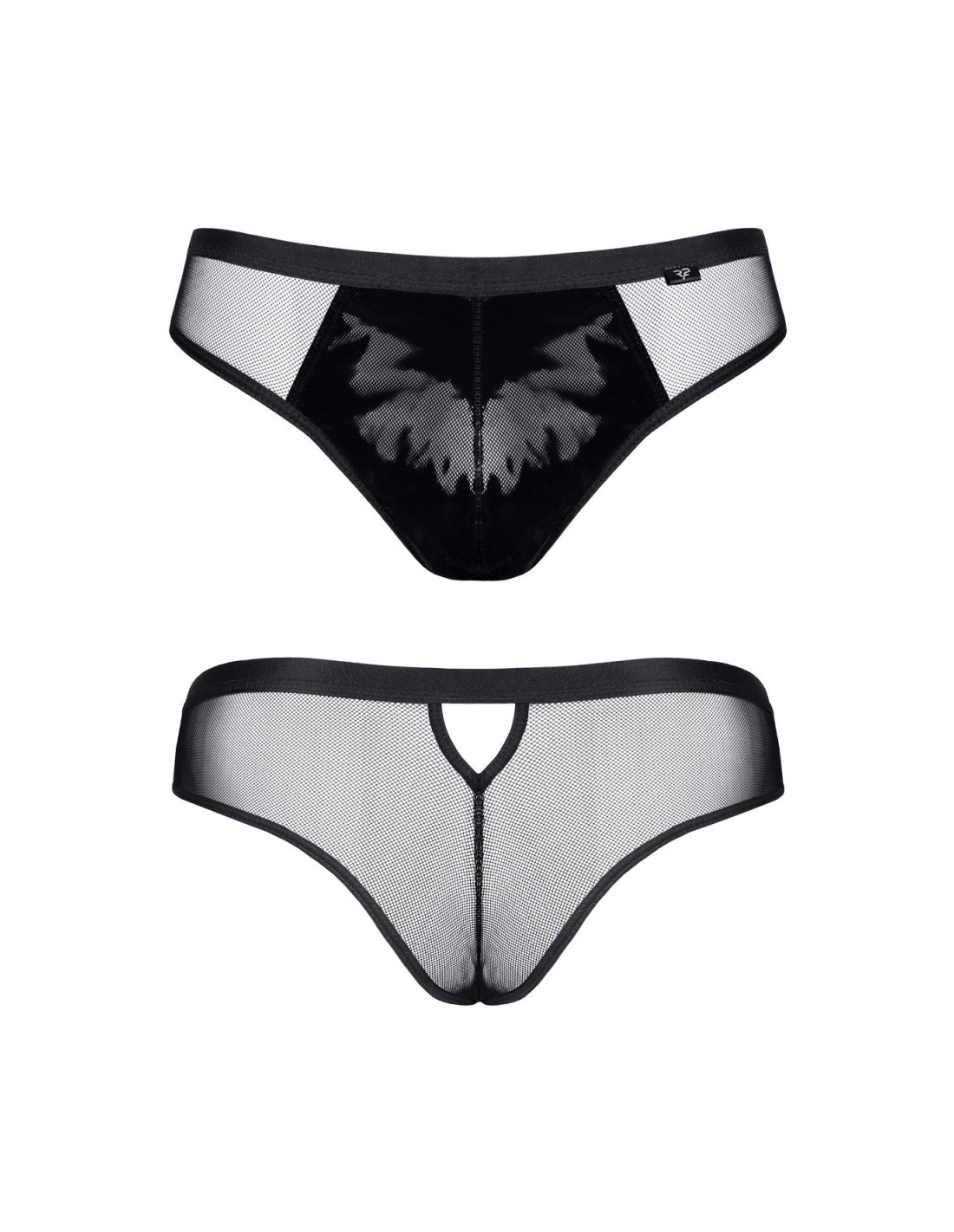 La marque Regnes Fetish Planet vous propose de découvrir ce slip type brésilien fabriqué en tulle noir extensible qui joue avec la transparence. Au niveau du sexe il est doublé dun vinyle noir brillant pour attirer loeil sans tout montrer. Ce slip sexy est maintenu fermement en place par une bande élastique large qui fait office de ceinture.